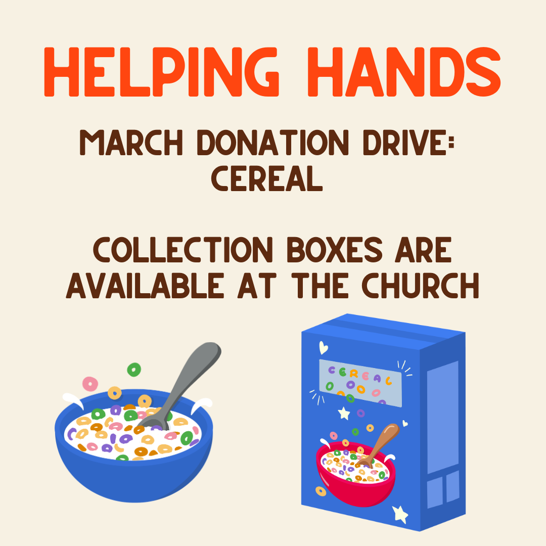 Each month we focus on a particular item/category of items to collect for the Helping Hands food bank. Donation bins are located throughout the church building, including in the narthex of the sanctuary, near the main entrance by the elevator, and inside the church office. Donations are compiled and brought to Helping Hands from the church.